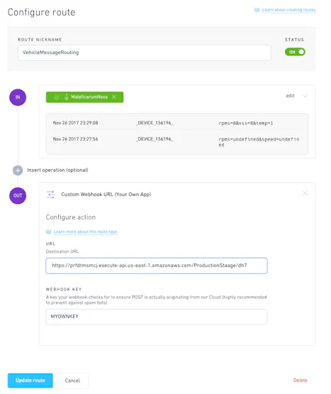 Now, lets update the hologram route to send the message to Amazon API gateway instead of our gateway's ip: